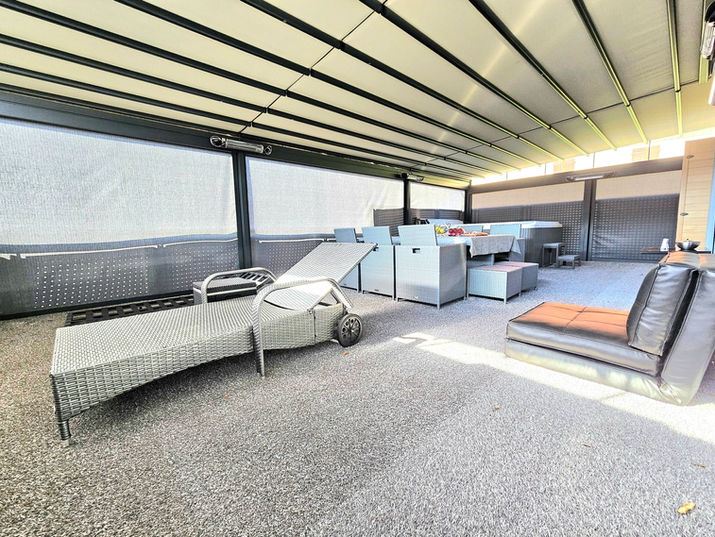 A particular highlight is the outdoor area: the high-quality terrace with a flexible roof system can be fully opened or closed both on the sides and above, allowing the space to adapt perfectly to any season. Combined with the whirlpool and sauna, this creates a private wellness area directly at home.